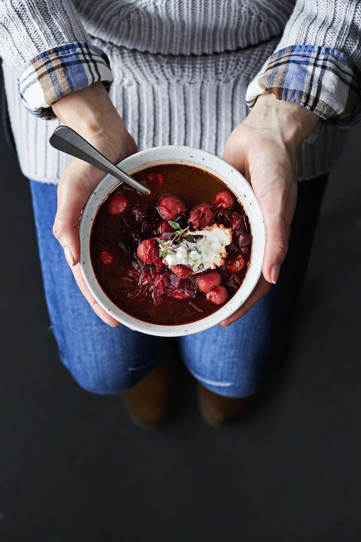 - Purista siskonmakkarat kuorestaan pieniksi palloiksi suoraan keittoon. Nosta lämpöä ja anna keiton kiehahtaa niin, että makkarat kypsyvät. Mausta keitto pippurilla ja etikkapunajuurien liemellä. Maista ja lisää tarvittaessa suolaa. Tarjoa kurkkusmetana keiton kanssa.