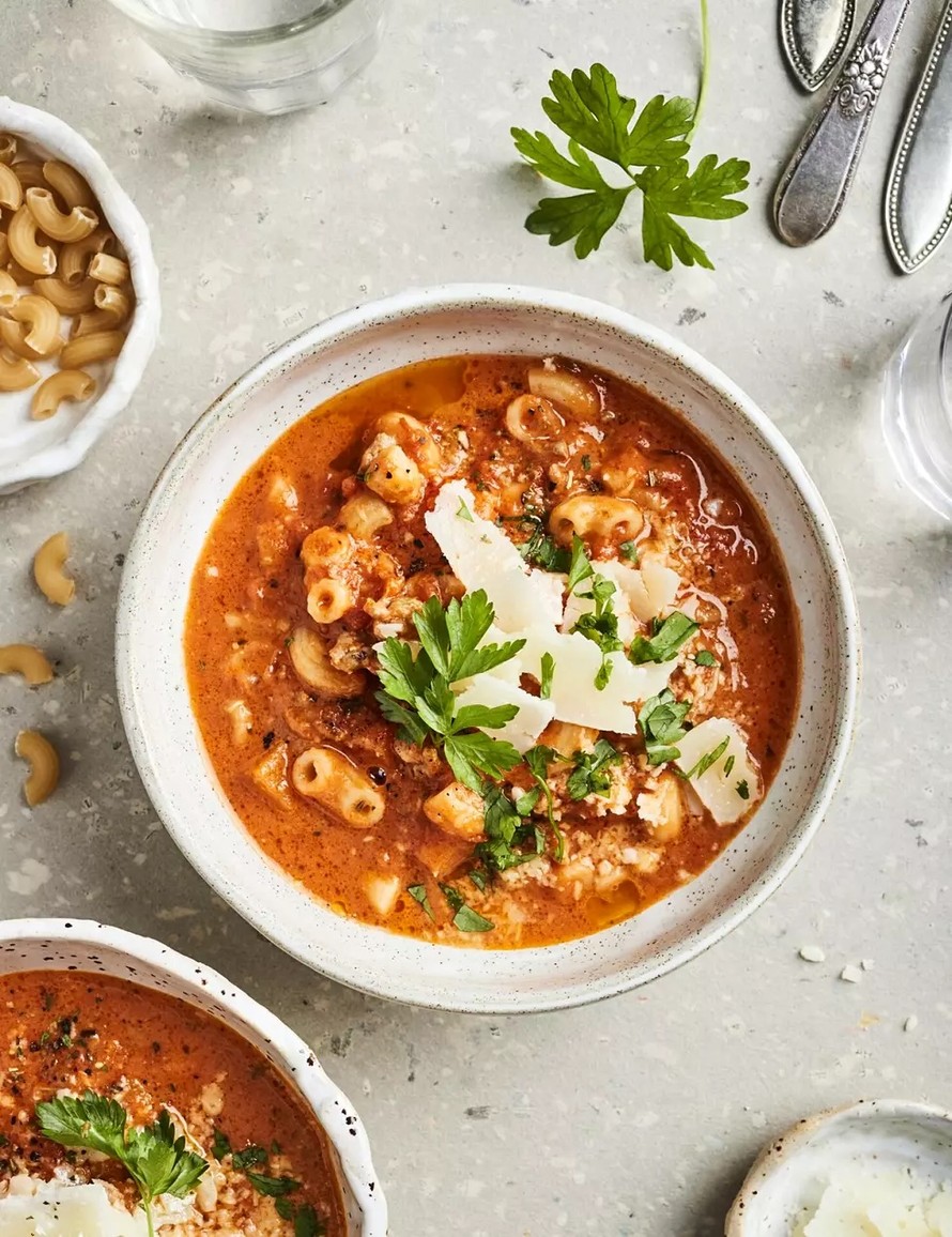 - Kaada joukkoon tomaattimurska ja kanaliemi. Kiehauta seos ja anna porista keskilämmöllä noin 5 minuuttia. Lisää kattilaan makaronit ja keitä noin 10 minuuttia, kunnes ne ovat kypsiä.