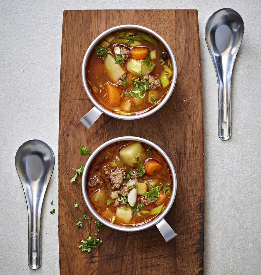 Maukkaan jauhelihakeiton salaisuudet? Maustepippurit, rosmariini ja hyvin ruskistettu jauheliha. Valmiiden keittokasvisten ansiosta soppa on pöydässä puolessa tunnissa.