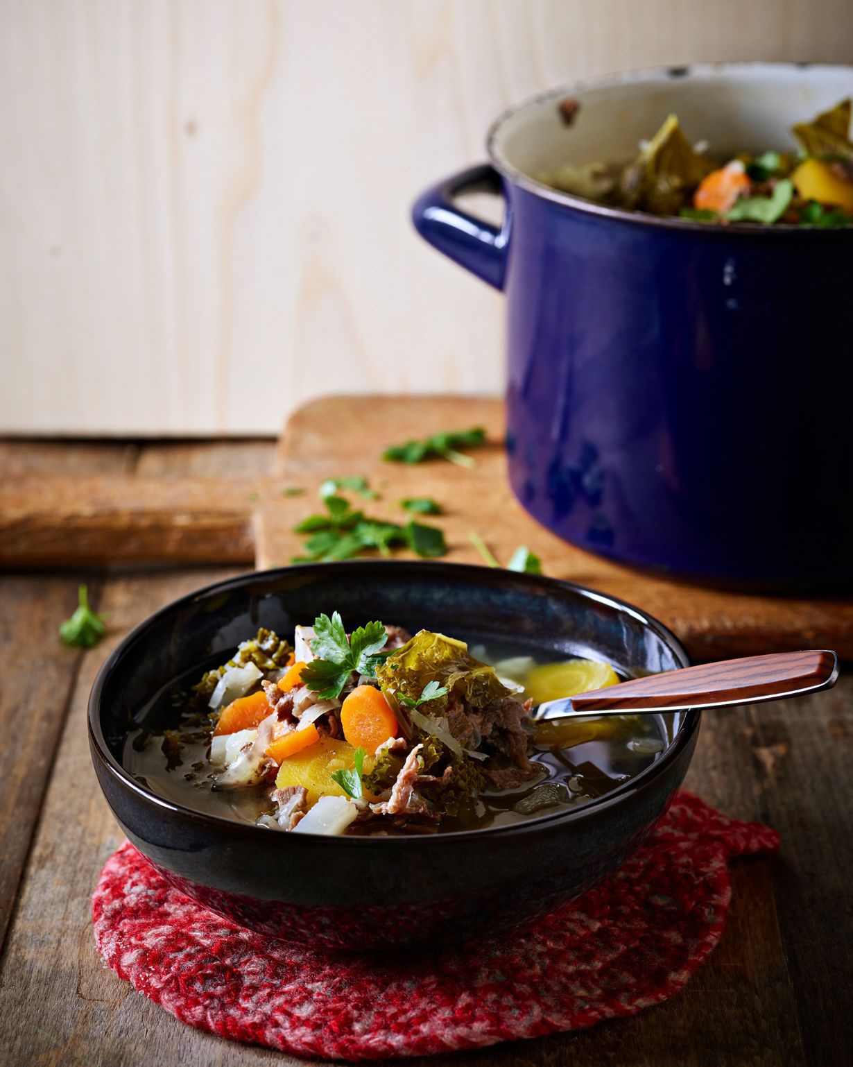 Poista lehtikaalista kova keskiruoti ja leikkaa kaalinlehdet suikaleiksi. Lisää molemmat kaalit keittoon ja keitä vielä noin 5 minuuttia. Lehtikaali saa jäädä napakan tuntuiseksi.