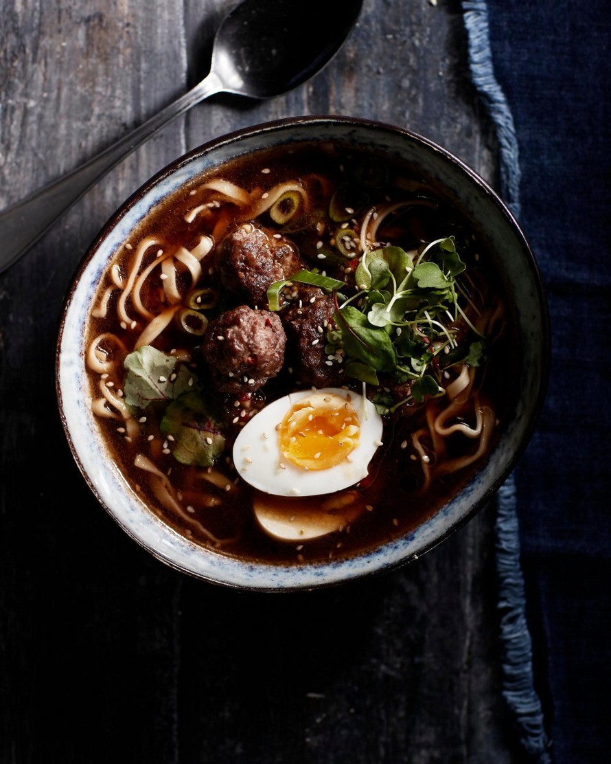 Toiveruoka yhdistää lihapullat ja ramenin samaan kulhoon. Inkiväärillä, chilillä ja valkosipulilla maustettu herkullinen soppa valmistuu puolessa tunnissa.