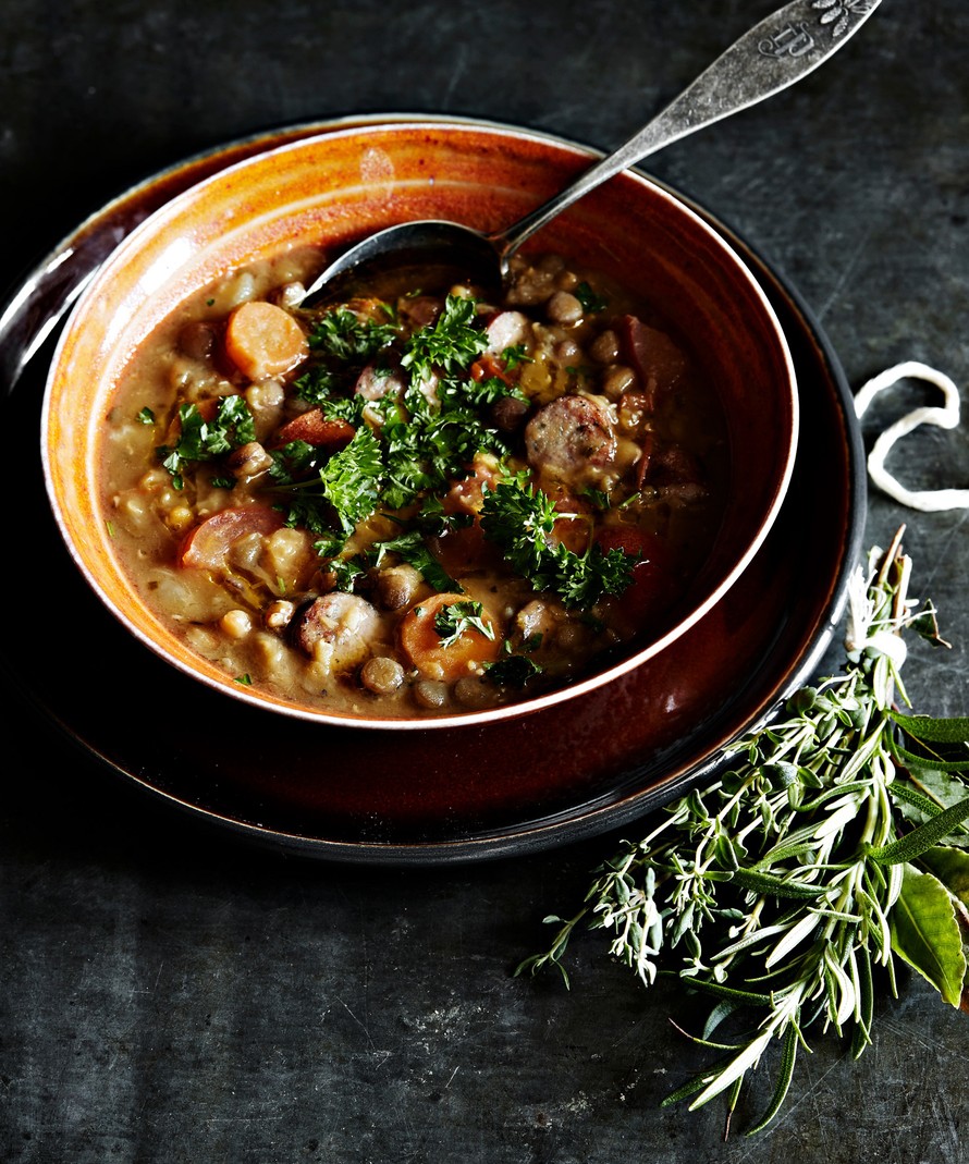 Ihanan sakea ja tuhti makkarakeitto saa ruokaisuutensa linsseistä. Mausta keitto ranskalaiseen tapaan yrttikimpulla, jonka voit napata keitosta pois ennen tarjoamista