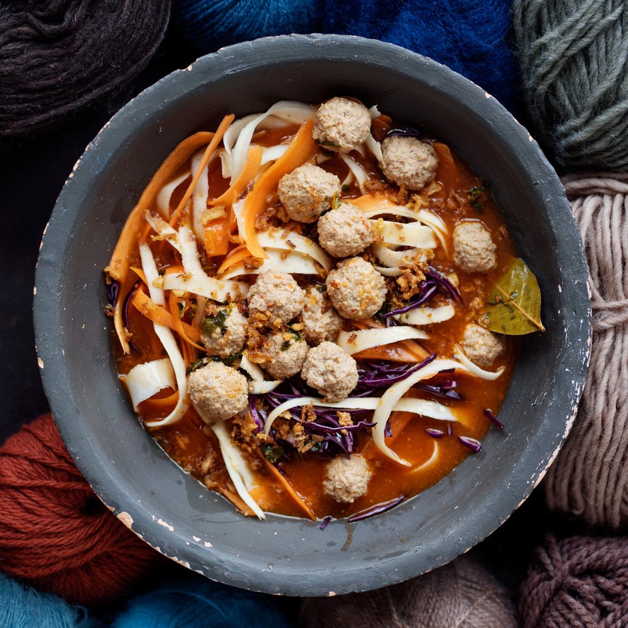 - Nostele keittokulhoihin porkkana- ja palsternakkalastuja sekä punakaalia. Lisää päälle kuumaa mausteista lihalientä ja possupyöryköitä. Ripottele päälle paahdettua sipulia.