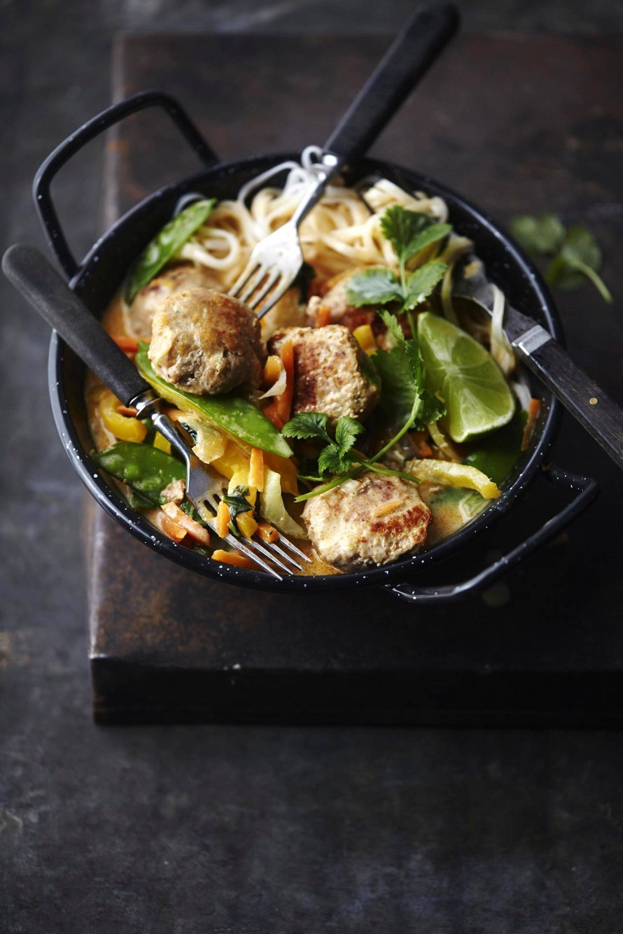 Kylvetä lihapullat vaihteeksi kookosmaitoisessa, thaimaustetussa liemessä.