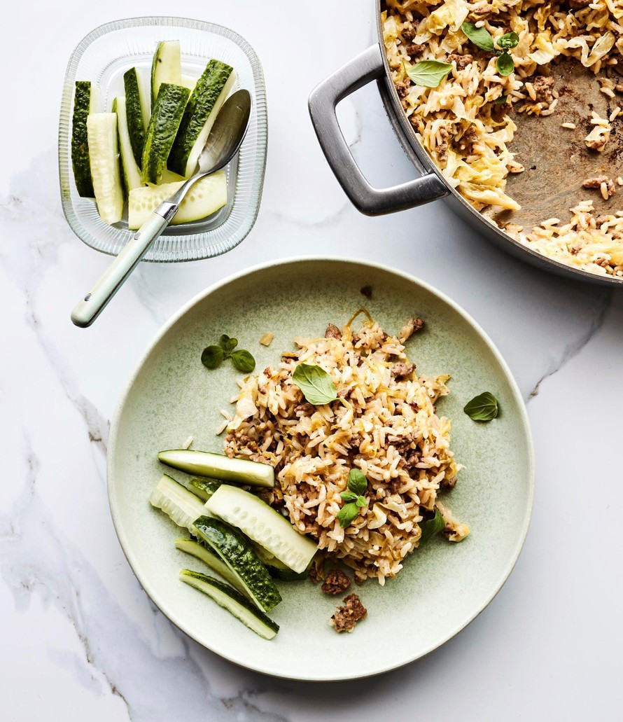 Saammeko esitellä: huijarin kaalilaatikko! Varhaiskaalista valmistuva ruoka syntyy näppärästi paistinpannussa ja sopii kiireiseen arkeen paremmin kuin uunissa hautuva esikuvansa. Tarjoa kaalilaatikon kaverina hölskykurkkuja.