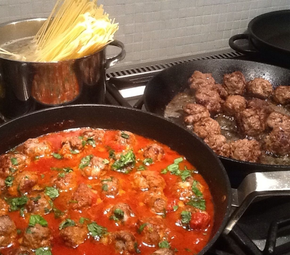 Tämä on meidän perheen lempiruoka. Parempaa itsetehtynä, koska Henri Alenin Mutti-kastike on niin hyvää! Googlaa Henri Alenin Mutti-ohje ja tee se x 2. Lihapullaohje alla. New Yorkissa lihapullat tarjoillaan aina tomaattikastikkeessa, poikani mielestä äidin tekemä on parempaa...