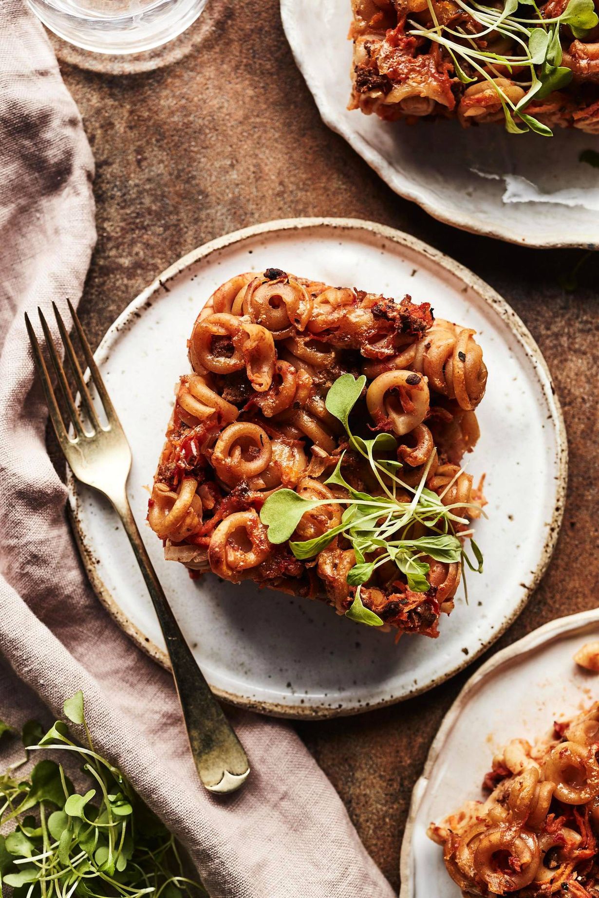 Paistetun jauhelihan lisäksi vuokaan uppoaa raastettuja porkkanoita ja täysjyväpastaa. Tomaattinen liemi sitoo ainekset yhteen. Esikypsennyksen jälkeen seos on valmis kumottavaksi laakeaan vuokaan. Päälle ripoteltu parmesaani gratinoi pastan herkulliseksi uunissa samalla kun ainekset kypsyvät loppuun.