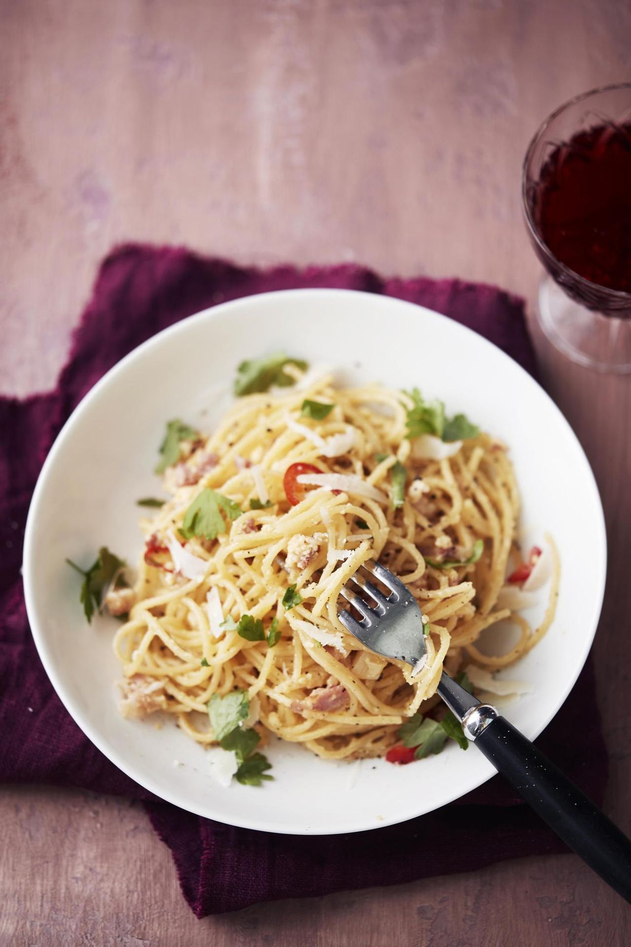 5. Kääntele kastike ja pekoniseos kuumana pastan joukkoon. Hienonna persilja ruokaan ja tarjoa se heti.
