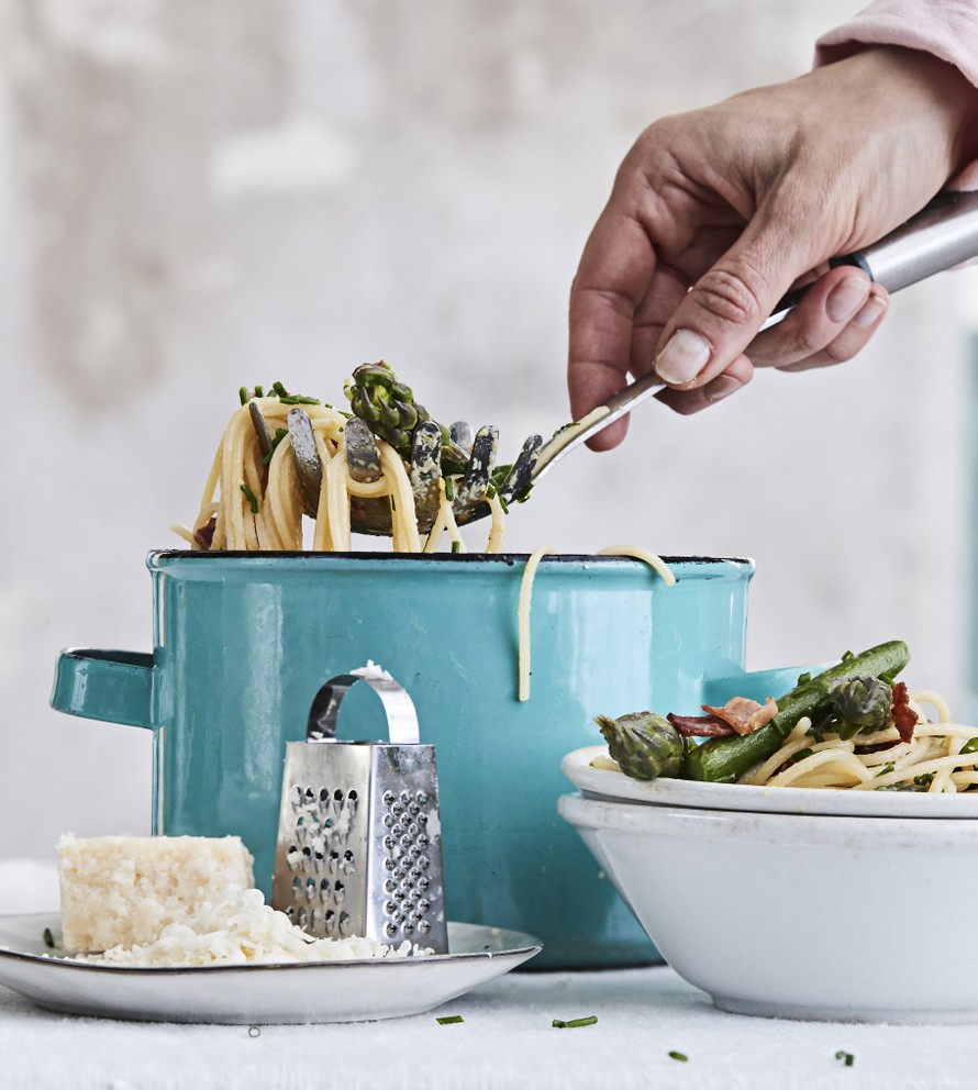Ei siitä pääse mihinkään: parsan ja pekonin yhdistelmä on täydellinen. Tässä carbonaraa mukailevassa kevätpastassa parsat kiehautetaan pastan seassa – ja kaikki tietenkin al denteksi.