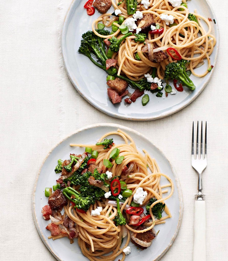 Parsakaali-vuohenjuustopastassa on rapeina sattumina pekonikuutioita ja leipäpaloja.
