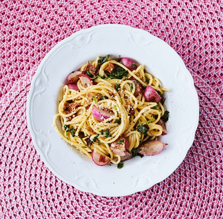 Alkukesän hapokkaat retiisit ovat täydellinen makupari pekonille. Paistettaessa niiden kitkeryys taittuu juuri sopivaksi.