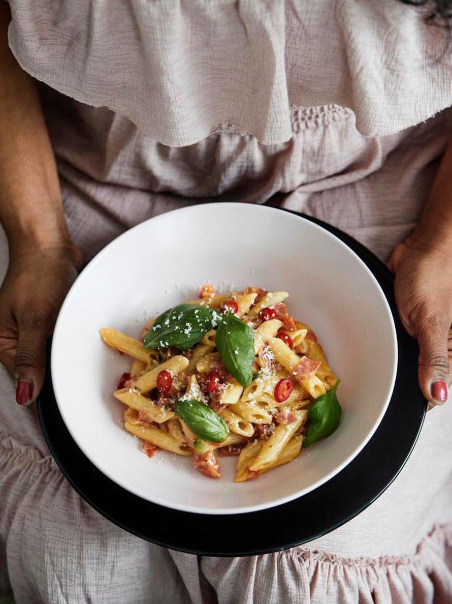 Valuta kypsä pasta ja yhdistä se kastikkeen kanssa. Lisää basilika. Tarjoa heti.