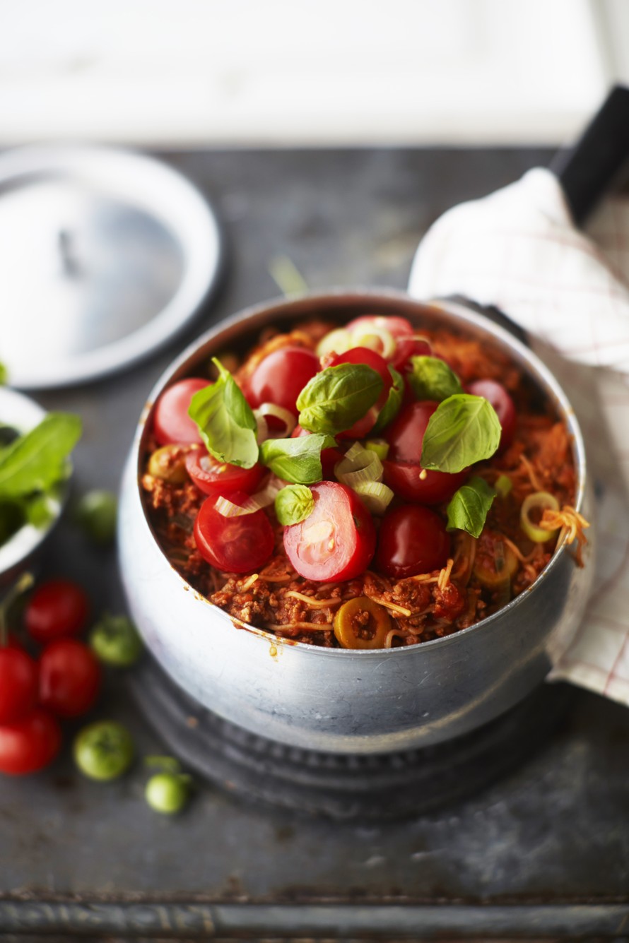 - Paista jauhelihaan kaunis väri öljyssä kattilassa. Lisää pastakastike ja kasvisliemi. Anna seoksen kiehahtaa. Lisää pasta ja keitä, kunnes se on kypsää. Huomioi, että kypsennysaika on pidempi kuin vedessä keitettäessä.