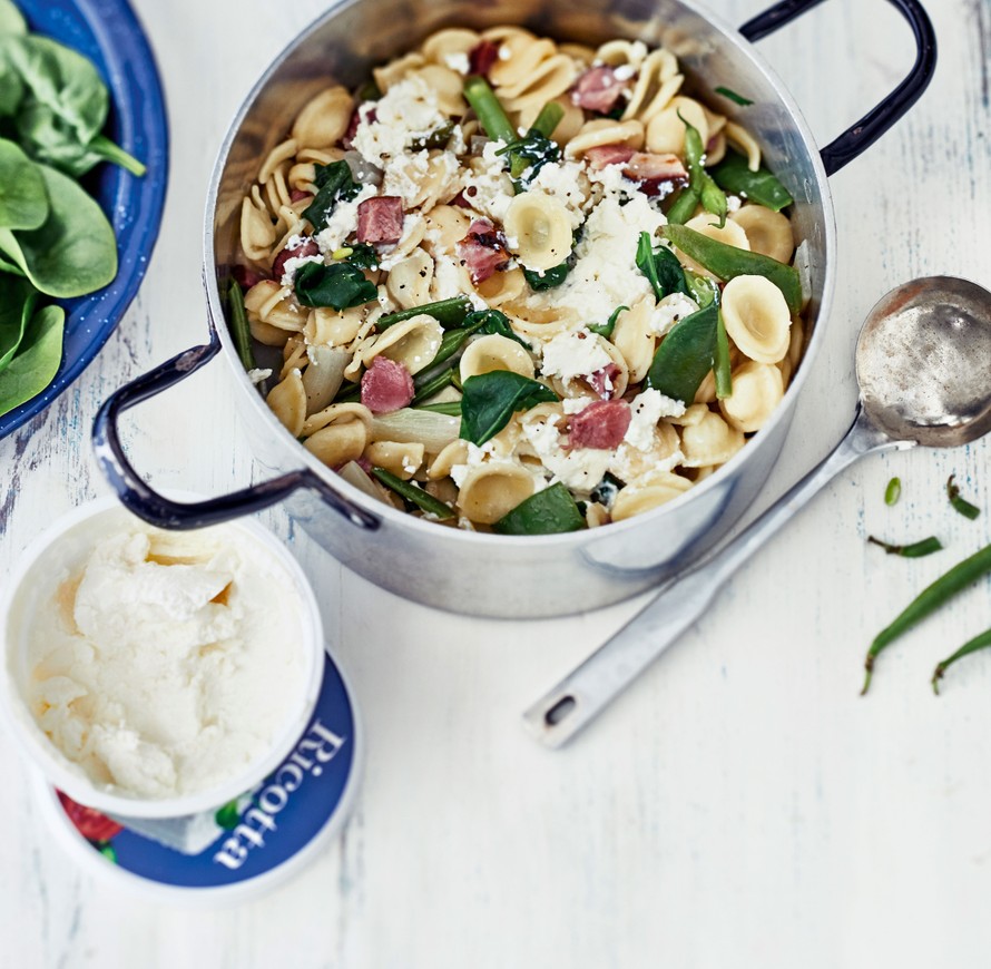 Yhden kattilan potkapasta on superhelppo mutta uskomattoman rehevän makuinen! Lusikoi ricotta joukkoon suurpiirteisiksi sattumiksi vasta pöydässä.