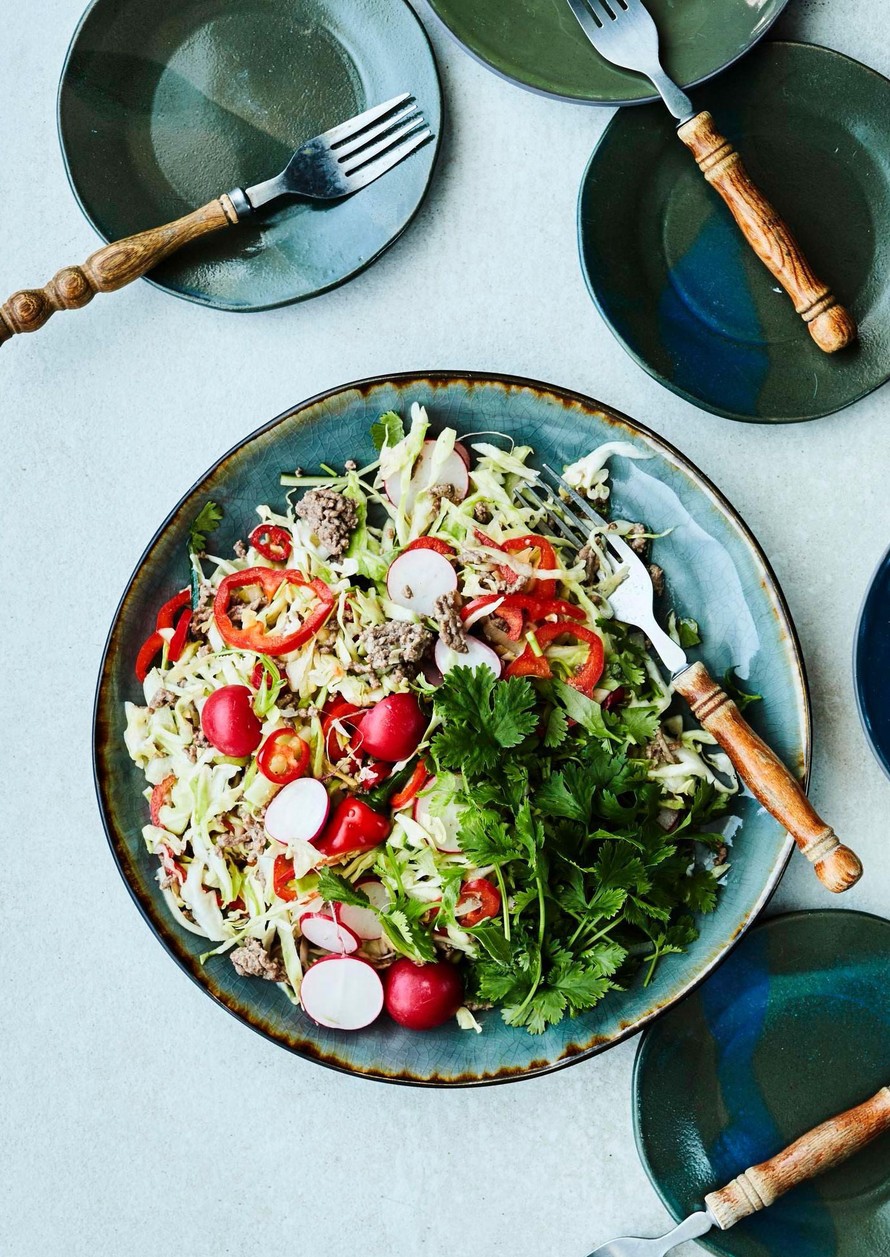 Riittoisa jauhelihasalaatti on täynnä lempeäntulisia thaimakuja. Varhaiskaali pysyy rapeana, kun se vain sekoitetaan jauhelihaseoksen joukkoon.