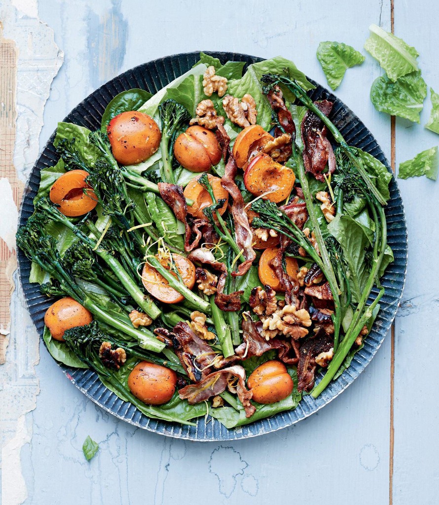 Nosta pekonit, pähkinät, parsakaalit ja aprikoosit salaatin päälle. Viimeistele tuoreilla yrteillä. Tarjoa heti leivän kanssa.
