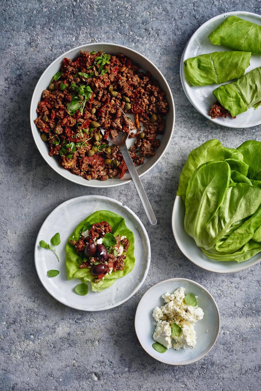 Karitsanjauheliha vie ajatukset automaattisesti Välimerelle, etenkin kun sen maustaa valkosipulilla, tuoreella oreganolla ja pienellä määrällä chiliä. Tomaattipyree tuo kaivattua hapokkuutta jauhelihatäytteeseen ja tuoreet tomaatit raikastavat kokonaisuuden. Näiden lisäksi salaatinlehtien sisään kääräistään tietysti murusteltua fetaa.