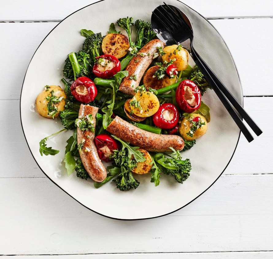 - Huuhtele rucola ja laita salaattia tarjoilu- tai annoslautasille. Lisää päälle lämpimät kasvikset, täytetyt paprikat ja makkarat.