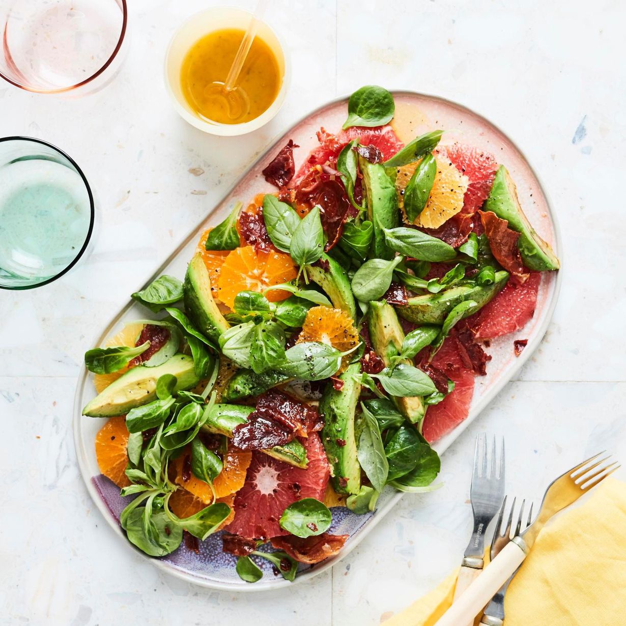 Väri-iloittelua salaattilautasella! Kirpeät sitrushedelmät tasapainottavat avokadon täyteläisyyttä ja kinkun suolaisuutta.