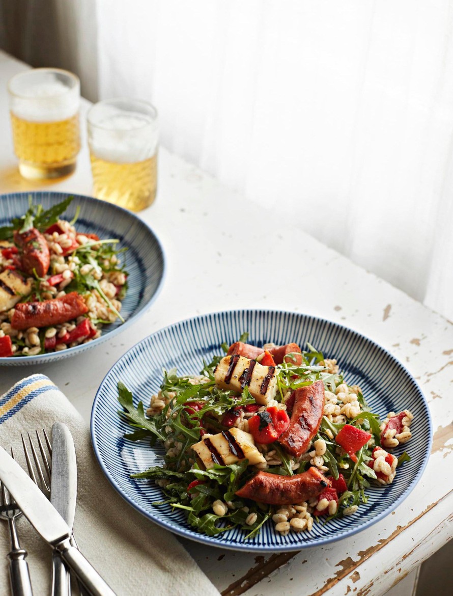 - Viipaloi halloumi. Kuumenna grilli tai muurikka. Paista makkarat ja halloumi kypsiksi. Makkaroiden kypsennys vie noin 20 minuuttia ja halloumin 5 minuuttia per puoli. Leikkaa paahtuneet makkarat paloiksi.