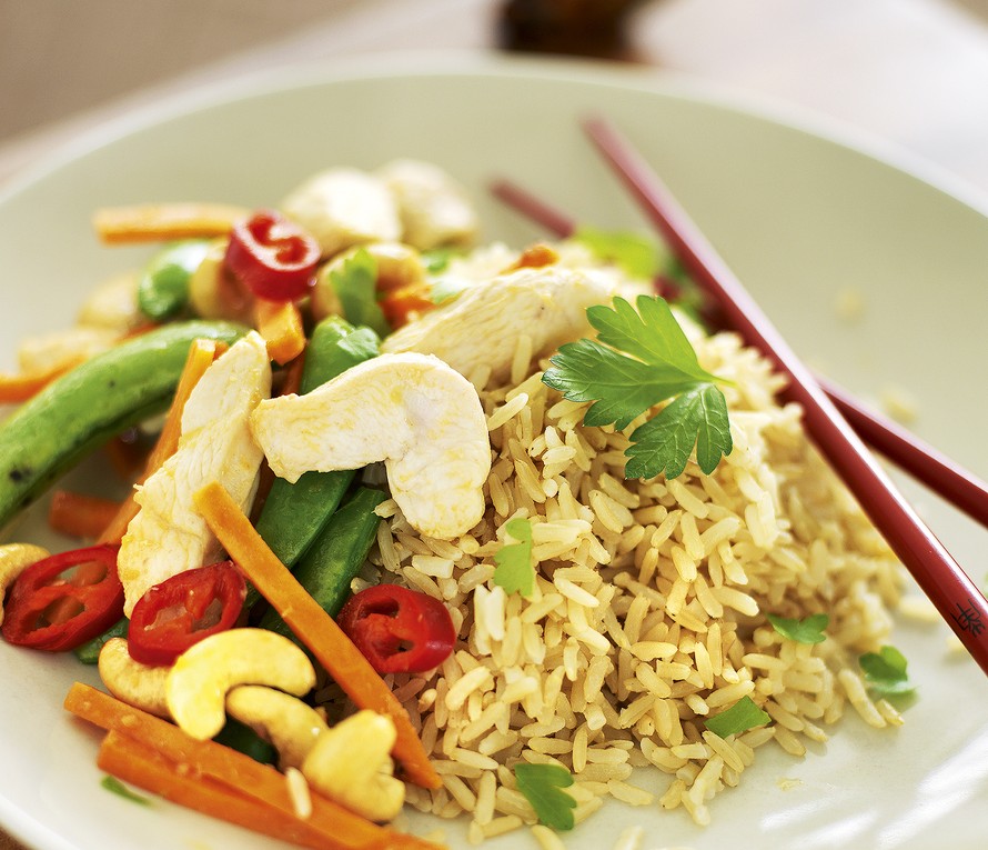 Kuumenna öljy vokkipannussa tai korkeareunaisessa paistinpannussa. Ruskista broilerisuikaleet pannulla. Lisää suola, soija, inkivääri ja chili. Lisää myös ohuet bataattisuikaleet ja jatka paistamista noin 5 minuuttia. Lisää lopuksi pannulle herneenpalot ja cashewpähkinät ja kuumenna. Tarkista maku, ja tarjoile täysjyväriisin kera.