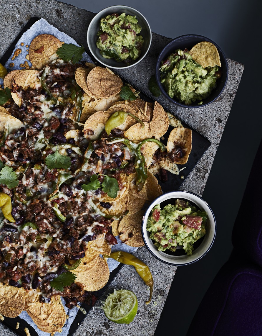 - Valmista sillä aikaa avokadodippi. Halkaise avokadot, poista kivet ja lusikoi hedelmäliha lautaselle. Murskaa avokadot haarukalla ja siirrä kulhoon. Halkaise limetit ja purista niiden mehu avokadojen päälle. Huuhdo ja leikkaa tomaatti pieniksi kuutioiksi. Hienonna myös korianteri. Sekoita kaikki ainekset keskenään. Tarkista maku. Jaa pieniin kulhoihin, joista jokainen voi napata omansa lautaselleen dippikastikkeeksi kuumille nachoille.