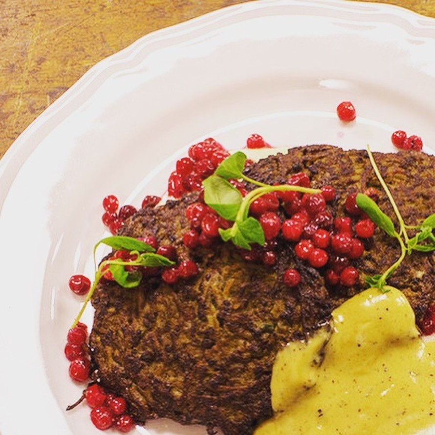 - Mausta puolukat kevyesti sokerilla. Tee perunamuusi. Tarjoa maksapihvit puikulamuusin, puolukoiden ja kermakastikkeen kera.