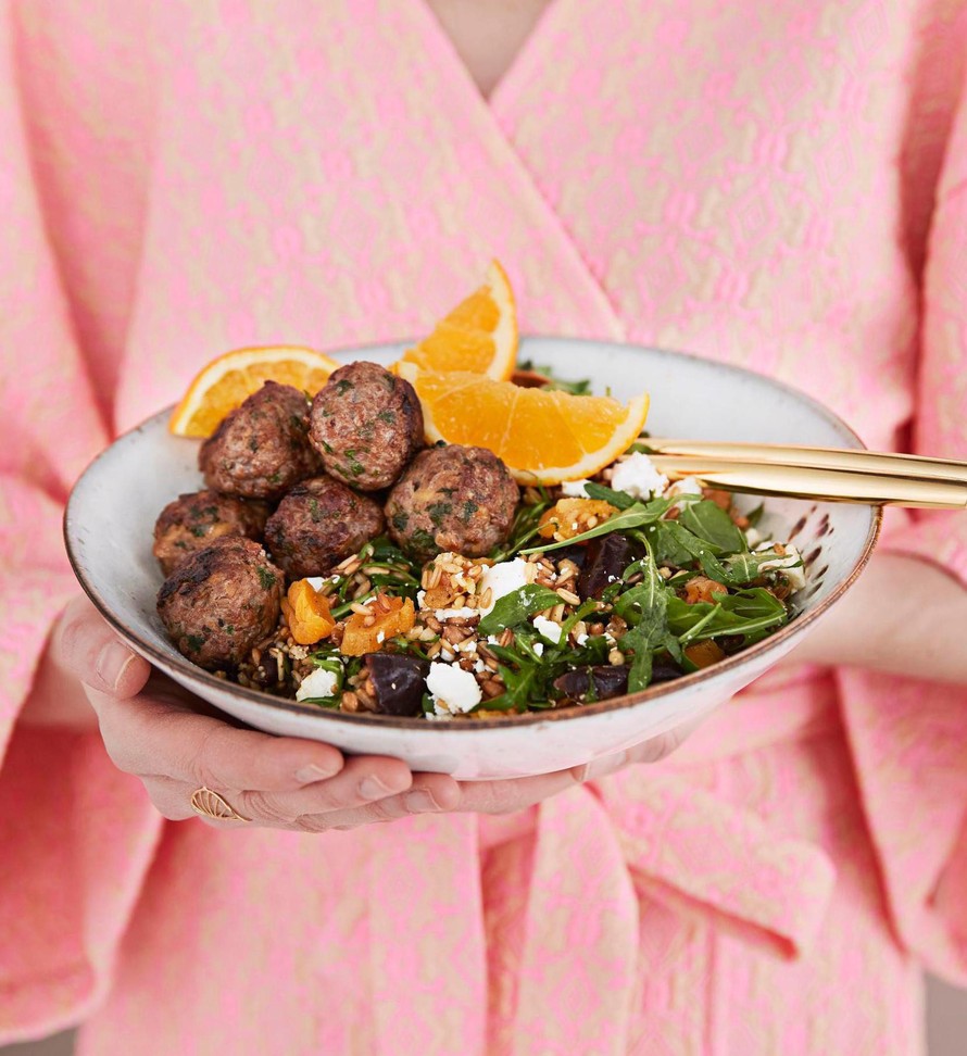 Inkiväärillä ryyditetyt karitsapullat ja fetalla ja taatelilla höystetyt jyvät ovat oikea lemmenpari.