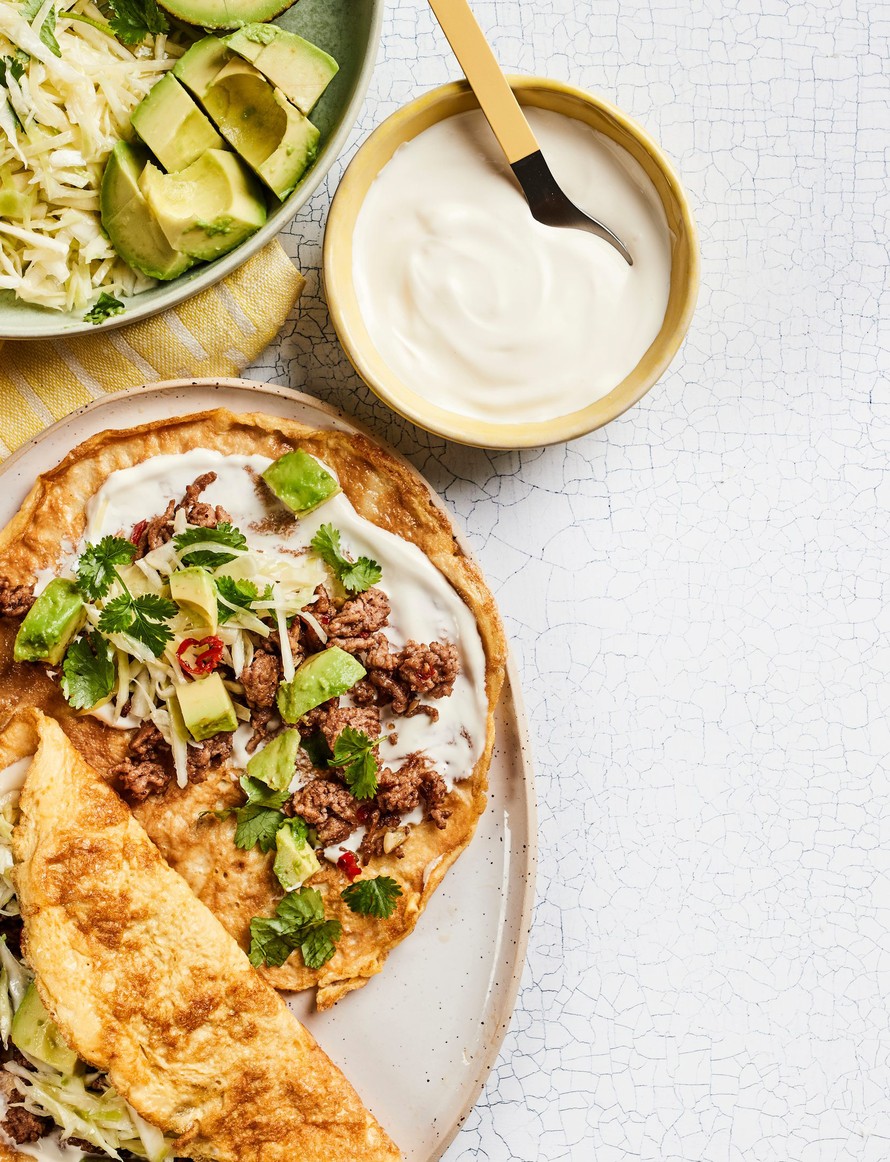 Korvaa valmistortilla omatekoisella munakasletulla ja kiepauta sisään mausteinen karitsanjauhelihatäyte ja mehevää kaalisalaattia. Ihanan mehevä lounas on valmis!