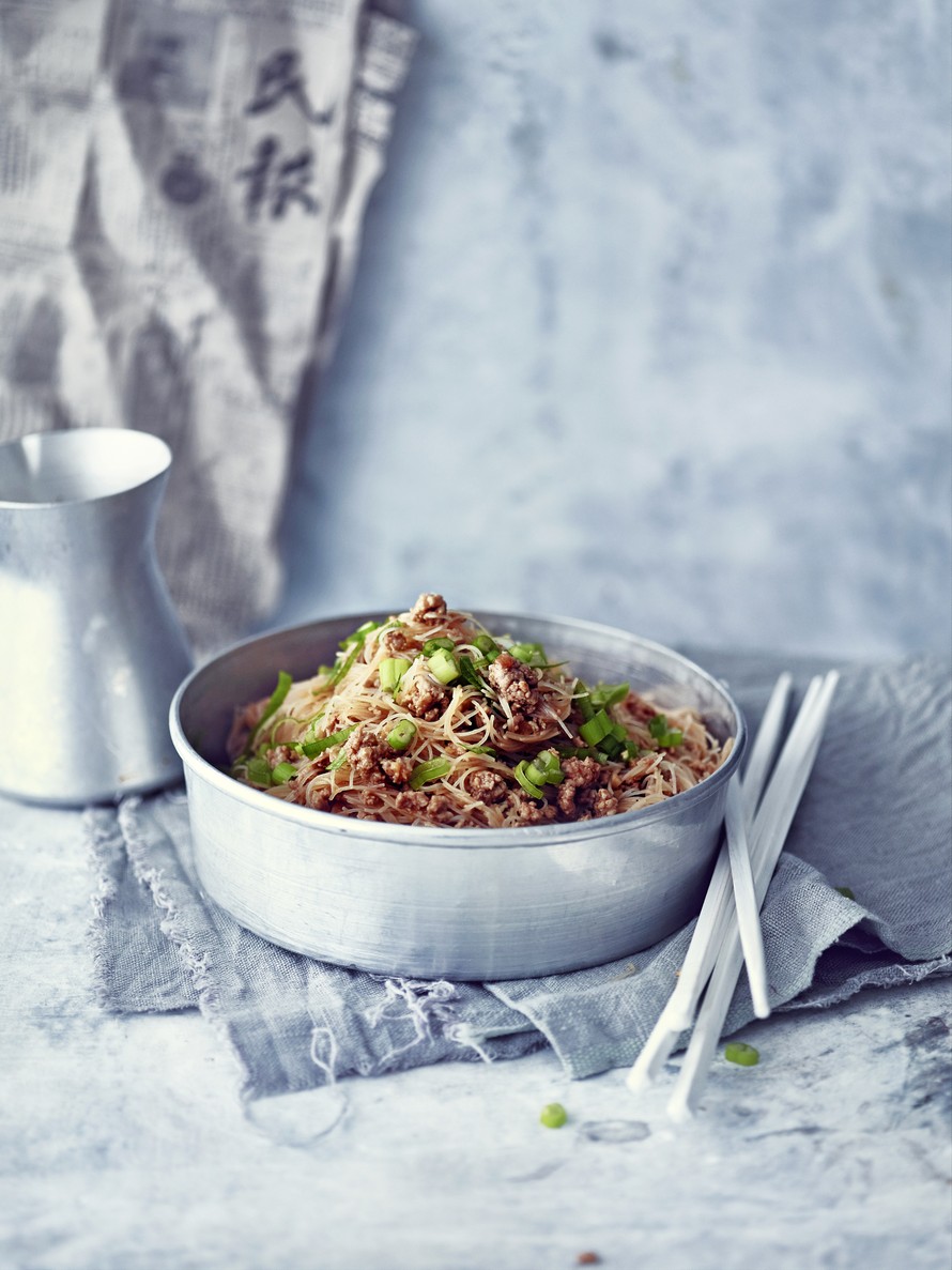 - Yhdistä nuudelit ja jauheliha. Viimeistele hienonnetulla kevätsipulilla.