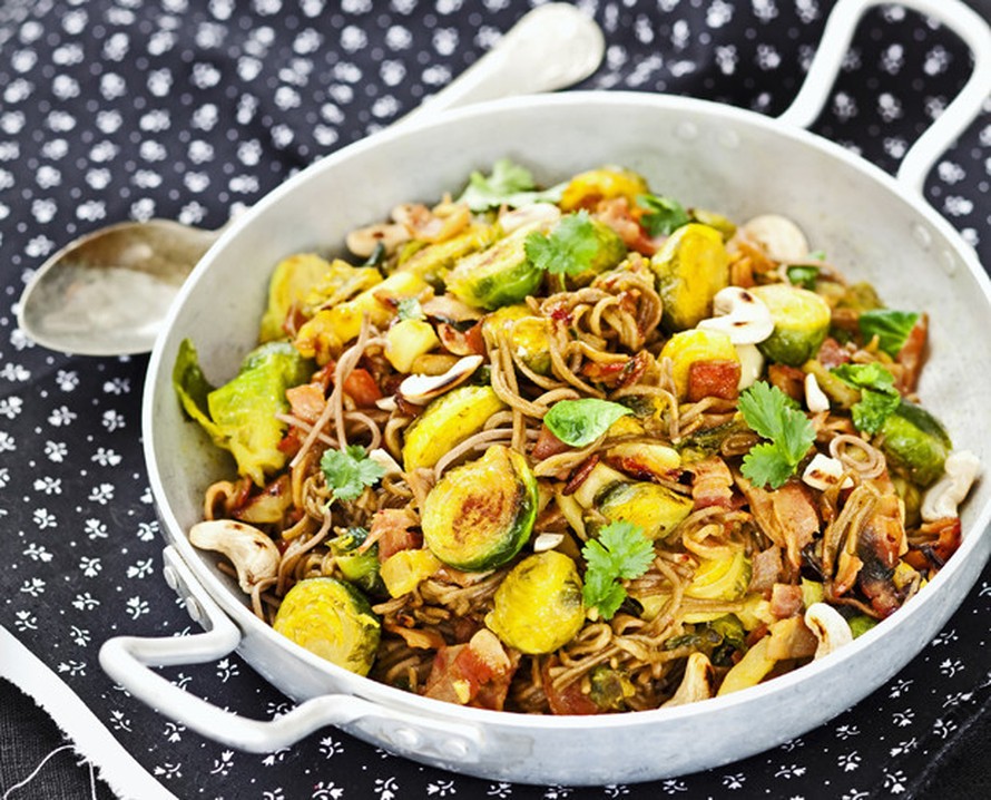- Puolita ruusukaalit ja keitä lähes kypsäksi kiehuvassa vedessä. Murskaa nuudelit lämmönkestävään kulhoon, kaada päälle kiehuvaa vettä ja anna pehmetä 5 minuutin ajan. Valuta.