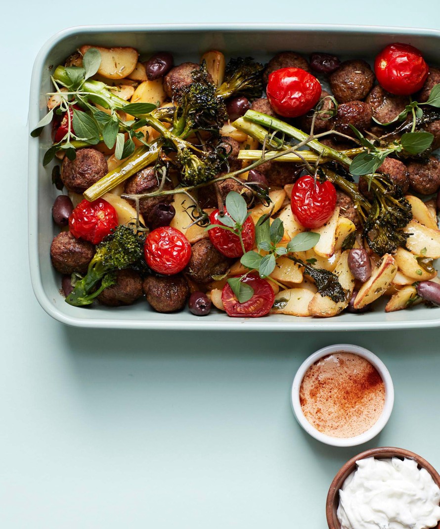 Lado leivinpaperilla vuoratulle uunipellille lihapullat, lohkoperunat, kasvikset ja oliivit. Paahda noin 20 minuuttia, kunnes perunat ovat rapeita.