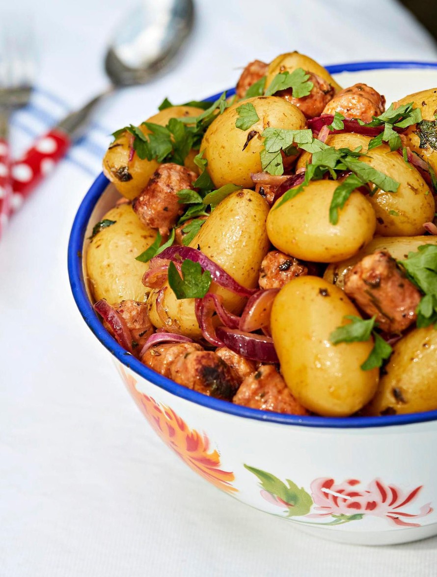 Lämmin makkara-perunasalaatti