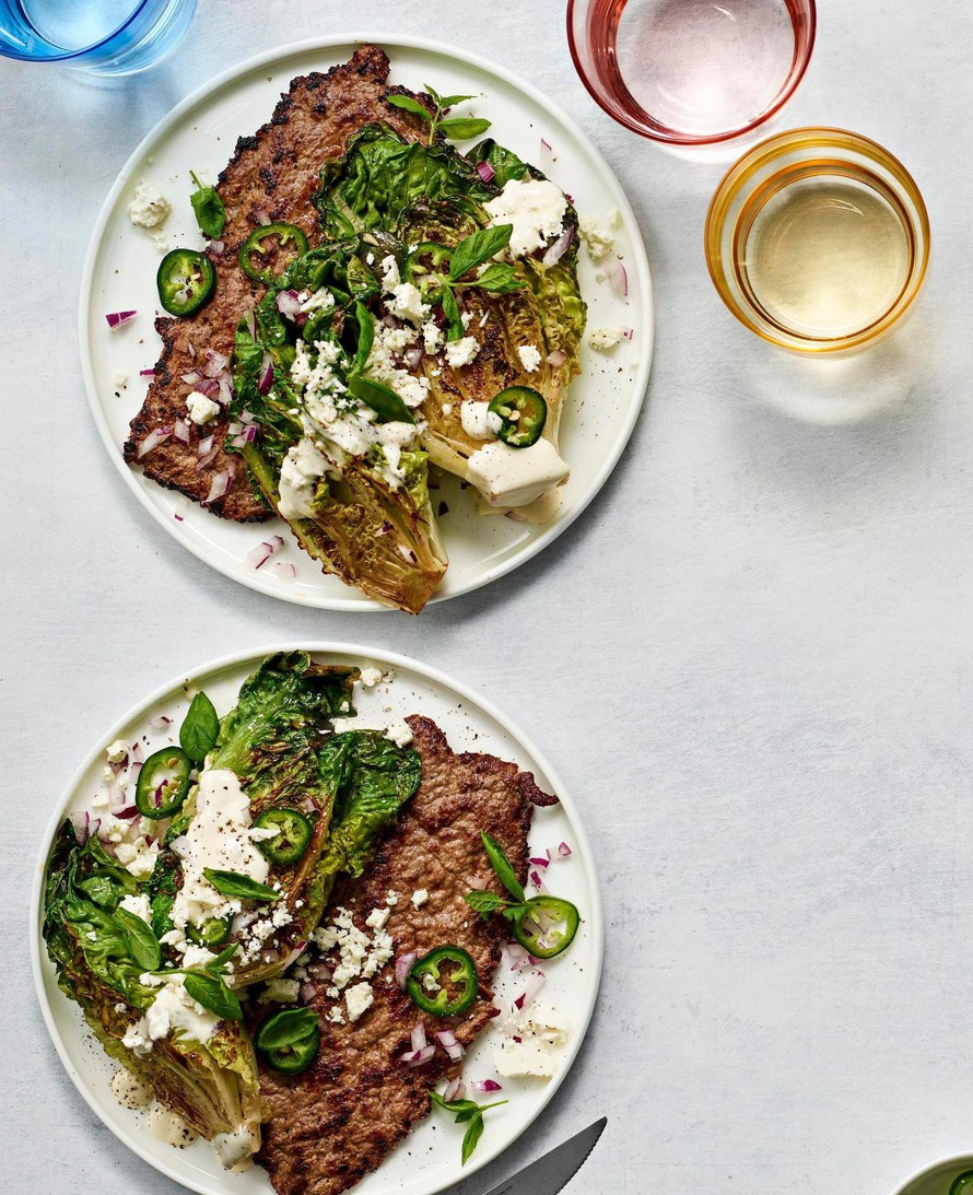 Siirrä pihvit lautasille ja kasaa päälle paistettua salaattia, jalapenoa, punasipulia ja kastiketta. Murustele fetaa päälle. Viimeistele annokset pippurilla ja mintulla.