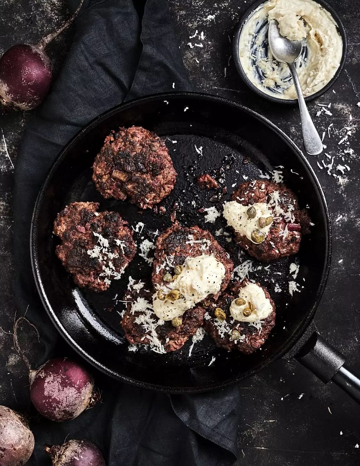 Lindströminpihveissä olennaista on hienoksi hakattujen etikkapunajuurien ja lempeän makuisiksi kuullotettujen sipulien runsaus. Lisukkeeksi sopii tujakka piparjuurikastike.