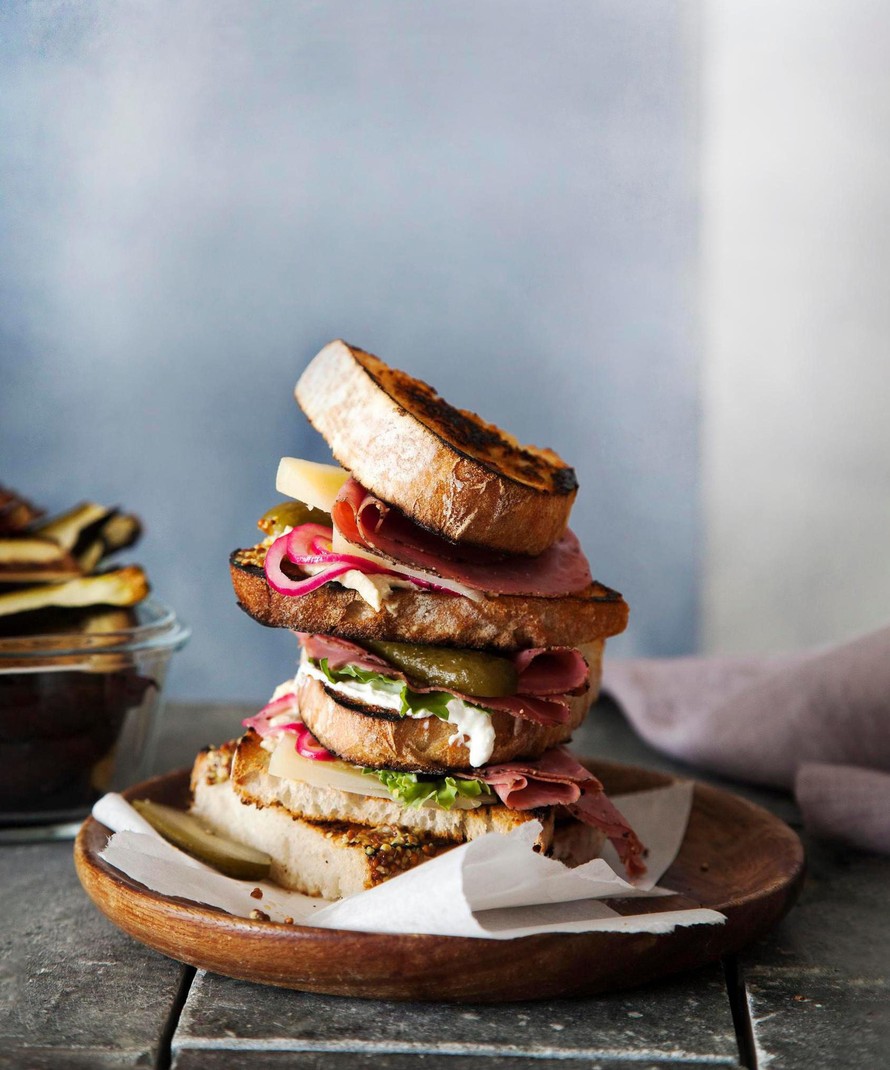 Aseta päälle toinen leipäsiivu ja täytä samoin, mutta laita sipulin sijaan viipaloituja kurkkuja. Kokoa leipä valmiiksi ja nauti.