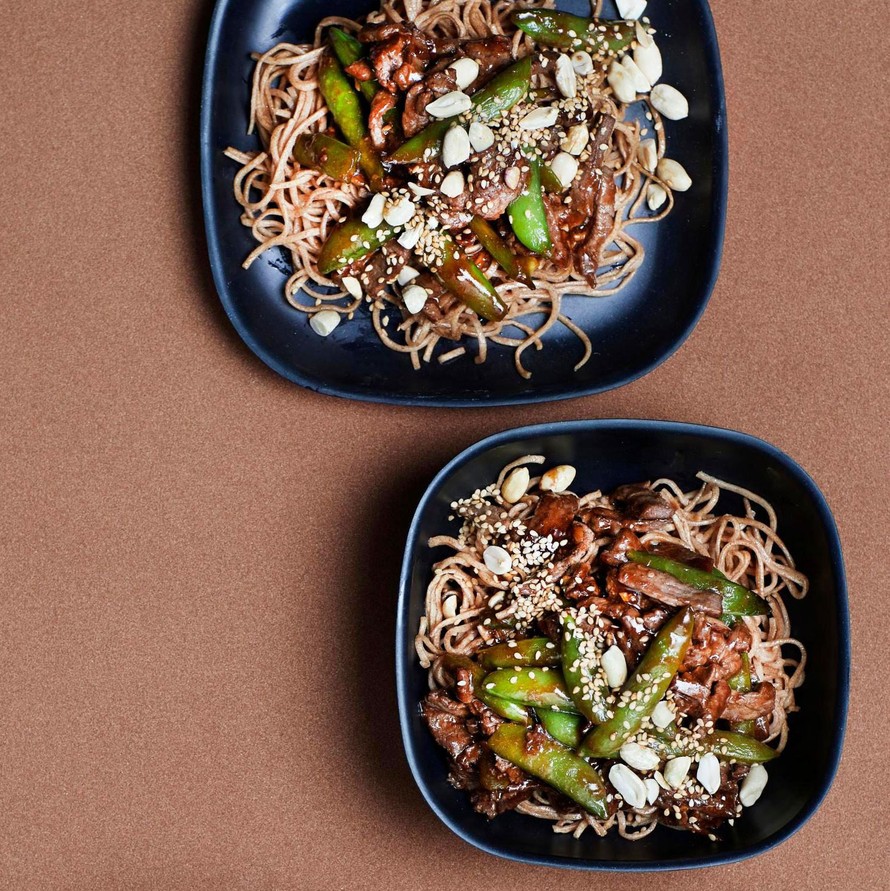 - Kuumenna öljy pannulla ja paista naudan minuuttisuikaleita 2–3 minuuttia. Lisää sokeriherneet ja paista vielä muutama minuutti. Kaada kastike joukkoon ja paista kovalla lämmöllä niin kauan, että kastike on ihanan kiiltävää ja tahmaista. Kaada kastike nuudeleiden päälle. Ripottele maapähkinät ja seesaminsiemenet päälle ja tarjoa heti.