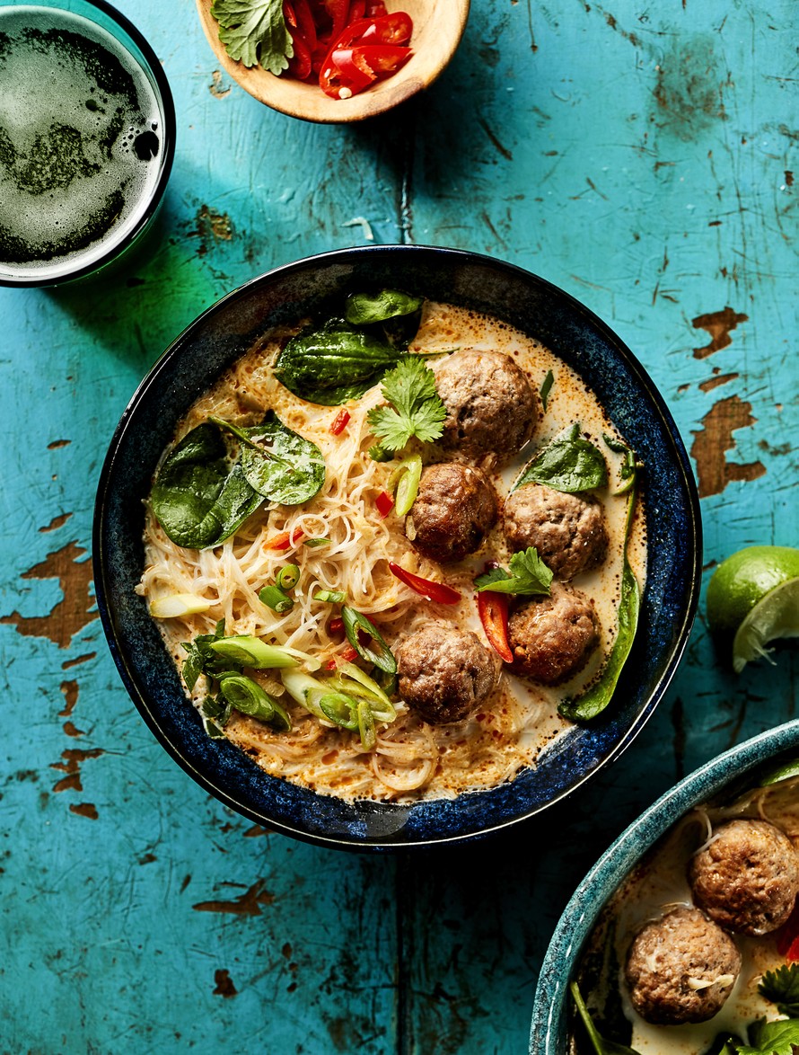 - Hienonna kevätsipulit ja purista limetin mehu ja lisää ne kattilaan. Lisää myös pinaatti ja lihapullat keittoon. Kuumenna ruoka vielä kertaalleen mutta älä enää keitä. Hienonna chilit ja korianteri ja tarjoa ne keiton kanssa.