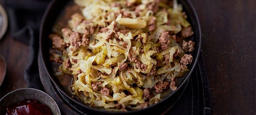 4. Kuumenna vesi esim. mikrossa. Sulata lihaliemi ja siirappi kuumaan veteen ja kaada kaalipaistoksen joukkoon. Hauduta kannen alla, kunnes kaali on pehmennyt.