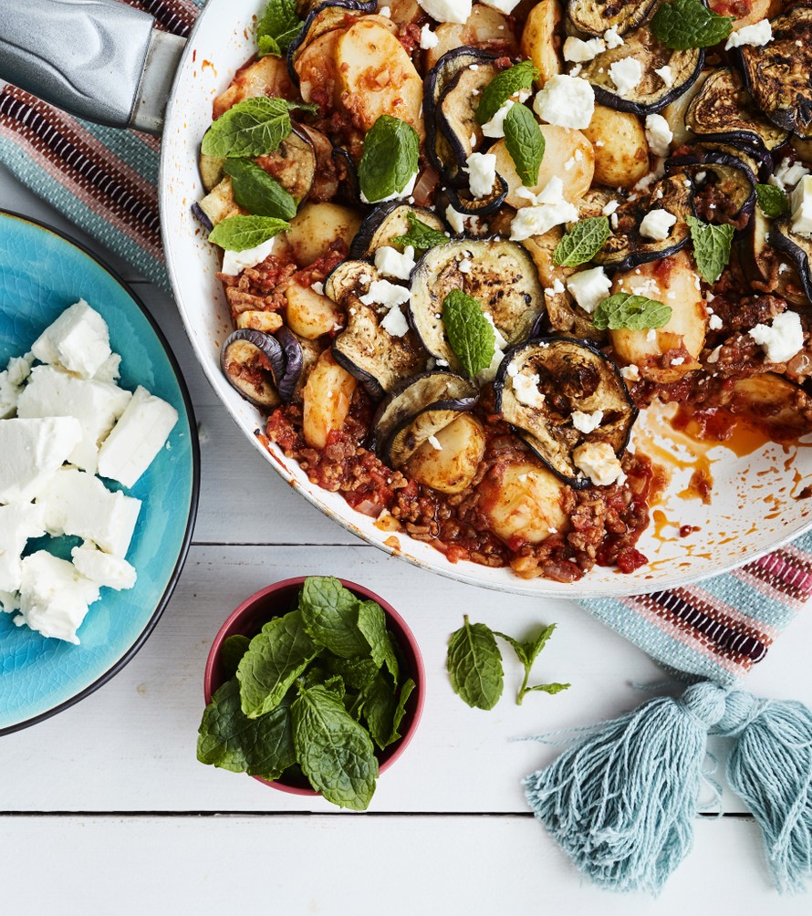 Moussaka onnistuu pannussakin. Paahda ensin munakoisot odottamaan. Paista sitten muut herkut. Lisää munakoisot, minttu ja feta pinnalle.