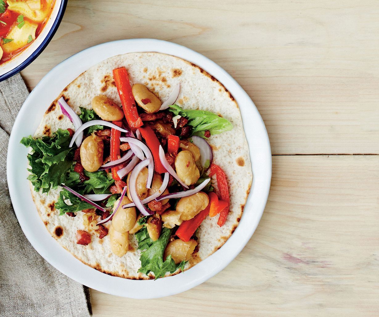 5. Kasaa tortillojen päälle salaattia,papu-pekoniseosta japunasipulia. Tarjoa kastikkeenkanssa.