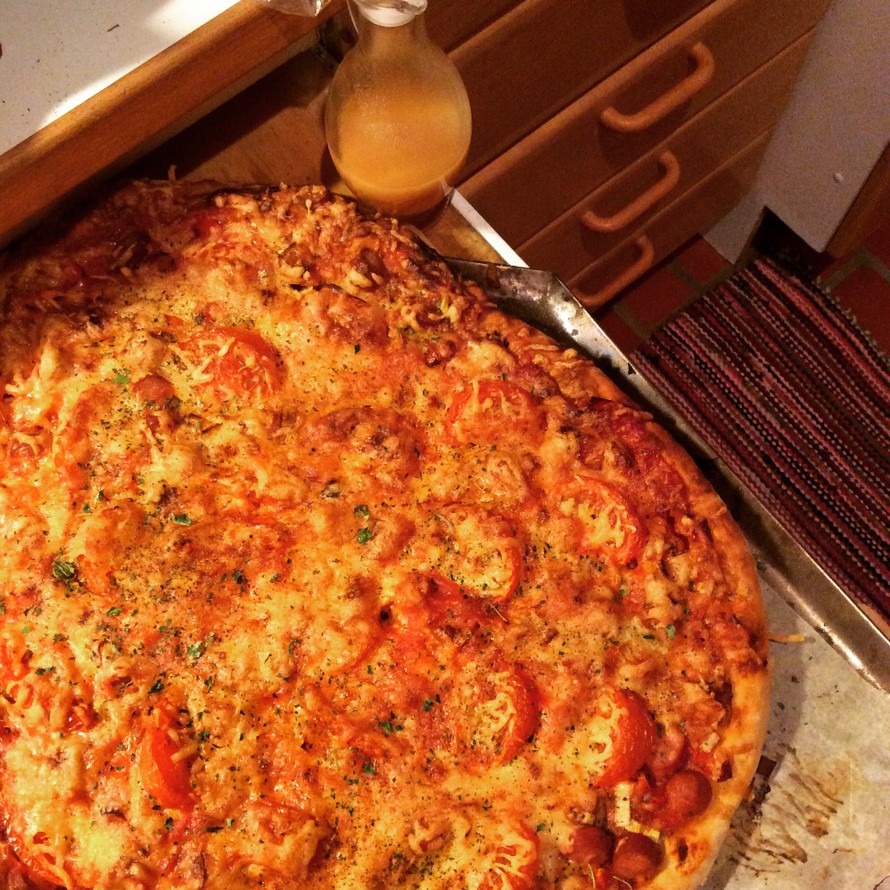 Kannatti, koska makeantulinen sinappikastike toimi pizzan kanssa todella hyvin! Se toi särmää muuten lempeään kokonaisuuteen ja korosti tietty nakkien makua. Kokeilin myöhemmin sinappikastiketta myös salaatinkastikkeena, eikä sekään ollut yhtään hullumpi yhdistelmä. (Tosin olenkin erilaisten maustekastikkeiden himokäyttäjä.) Alkuperäisohjeessa pizzan päälle ripotellaan aromisuolaa (se sopi pizzaan täydellisesti). Jos lisäaineet kammottavat, voi tilalla varmasti käyttää myös yrttisuolaa.