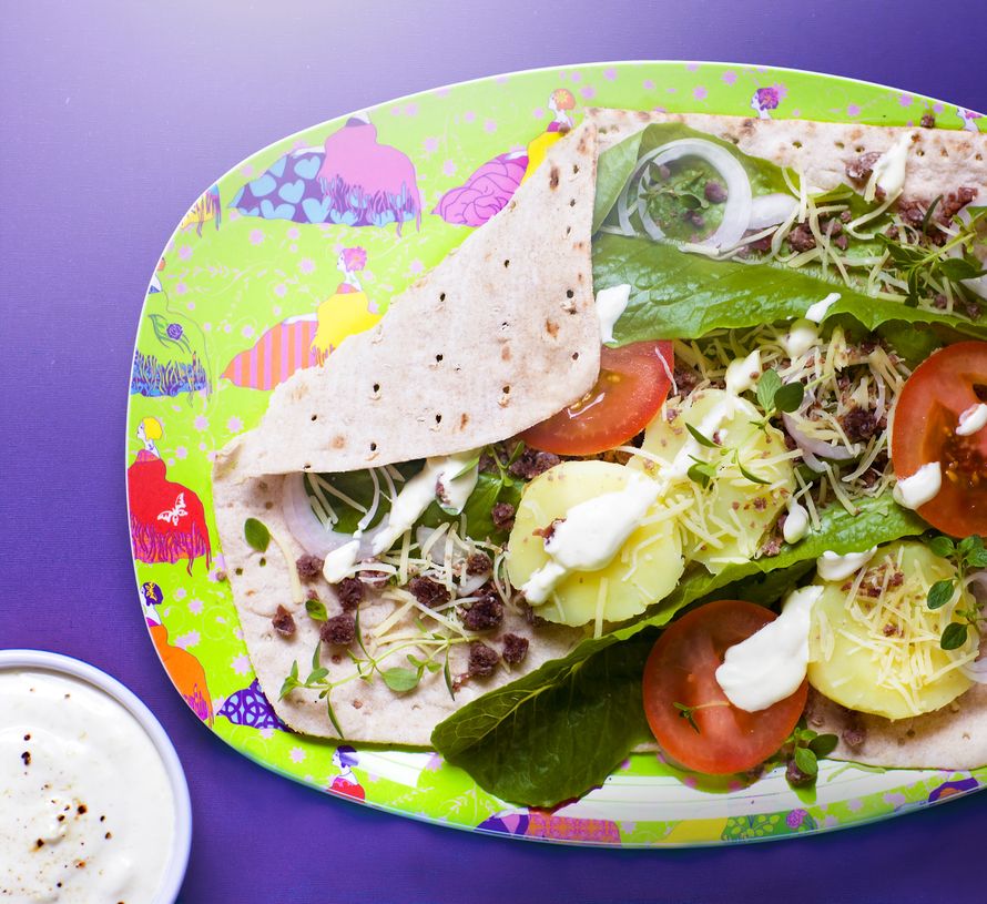 - Kuori ja leikkaa sipuli renkaiksi. Viipaloi tomaatit. Kuori ja viipaloi perunat. Levitä rieskoille sinappijogurttia, salaatinlehtiä, sipulirenkaita, tomaattia, perunaa ja poron kylmäsavurouhetta. Rullaa ja syö.