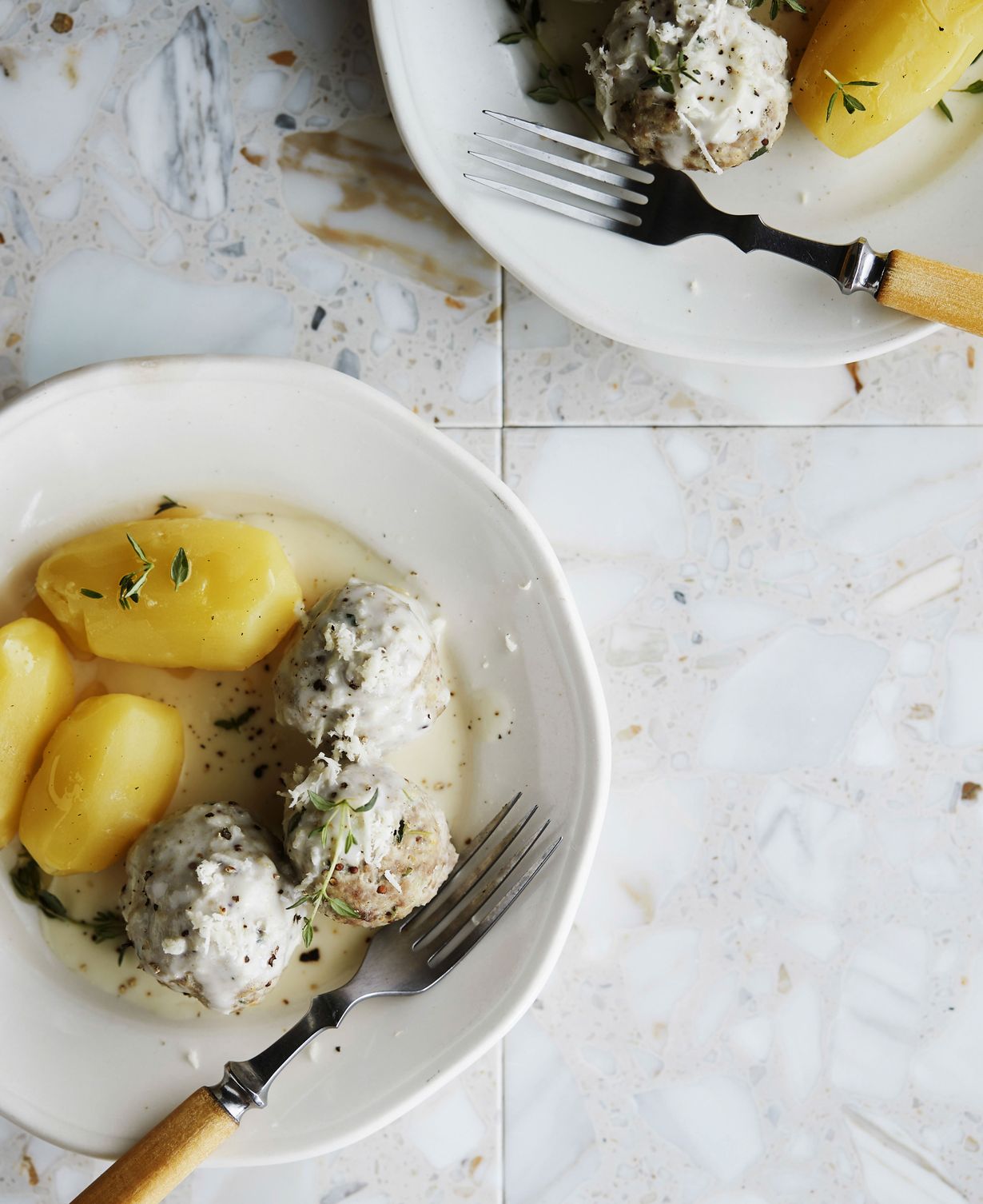 - Keitä pyörykät suolalla maustetussa vedessä (1 tl suolaa/1 l vettä) kypsäksi. Tähän kuluu noin 5 minuuttia. Säästä 1½ dl keitinlientä kastiketta varten ja pidä lihapyörykät lämpiminä folion alla.