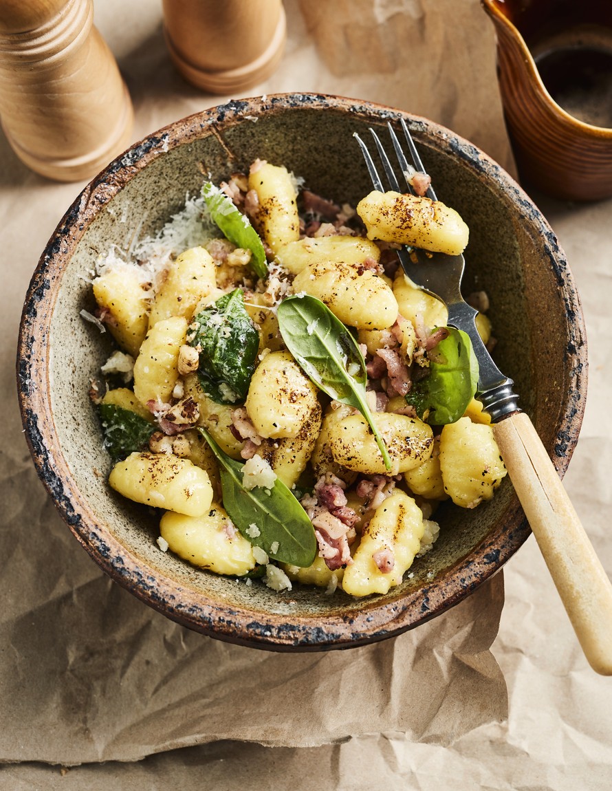 Tämä resepti on todellinen arki-iltojen pelastus. Tuoregnocchit kylpevät ruskistetussa voissa pekonin, pinaatin ja sitruunamehun kanssa. Rapea pähkinärouhe ja raastettu parmesaani sopii tämän annoksen viimeistelyyn kuin nenä päähän.