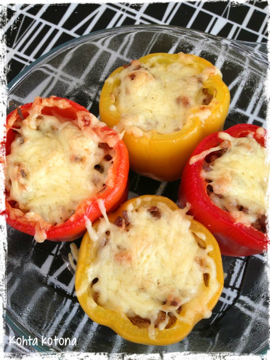 - Nosta paprikakupit kevyesti voideltuun uunivuokaan ja täytä ne jauhelihaseoksella. Ripottele pinnalle reilusti juustoraastetta ja paista 200-asteisessa uunissa noin 30 minuuttia.