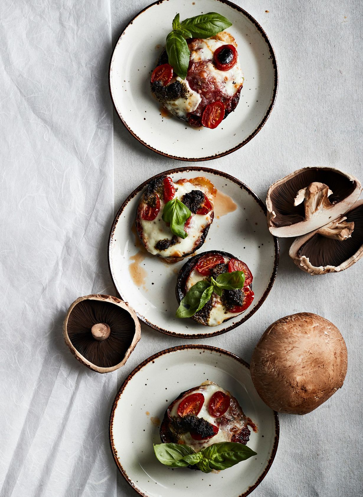 Oheisessa ohjeessa portobellojen eli jättiherkkusienten lakit täytetään pizzojen tapaan. Tällä kertaa lakkeihin lastataan pestoa, salamiviipaleita, mozzarellaa ja kirsikkatomaatteja.