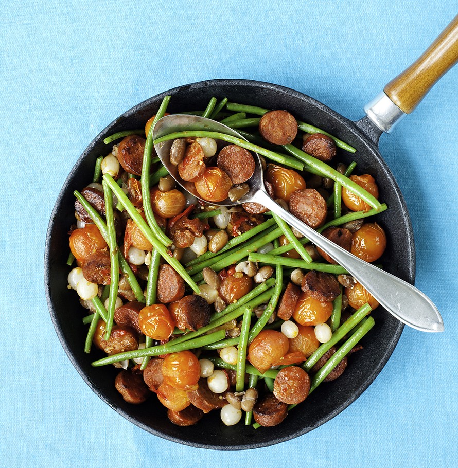 - Lisää makkara-tomaattiseokseen ruskeat ja vihreät pavut, hillosipulit ja timjami. Kuumenna hetki ja mausta vaahterasiirapilla ja mustapippurilla. Tarjoa paistos täysjyväriisin kera.