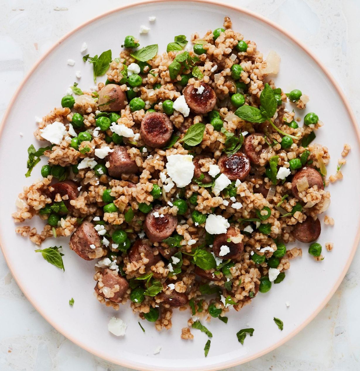 Laita makkarat takaisin pannuun, lisää jäiset herneet ja kuumenna ohratto vielä kertaalleen. Mausta suolalla ja pippurilla.