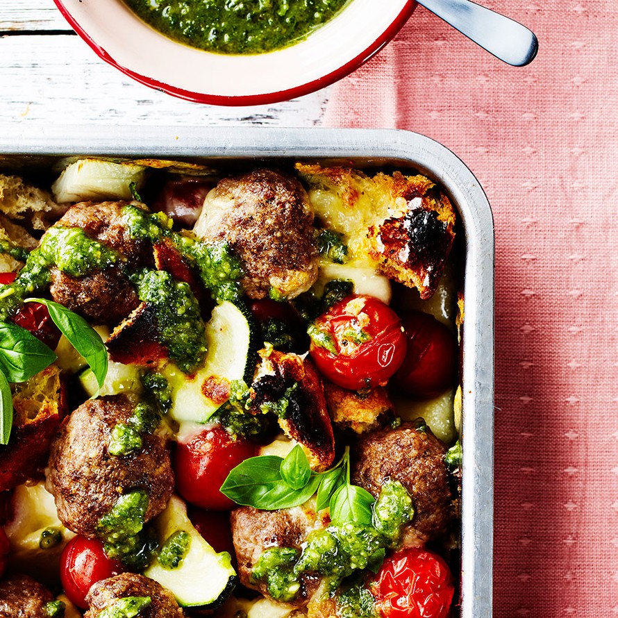 Kaikki samalla pellillä. Lihapullat saavat kaveriksi tomaatteja, kesäkurpitsaa ja rapeaa leipää, ja koko komeus kuorrutetaan mozzarellalla. Ei kun uuniin!